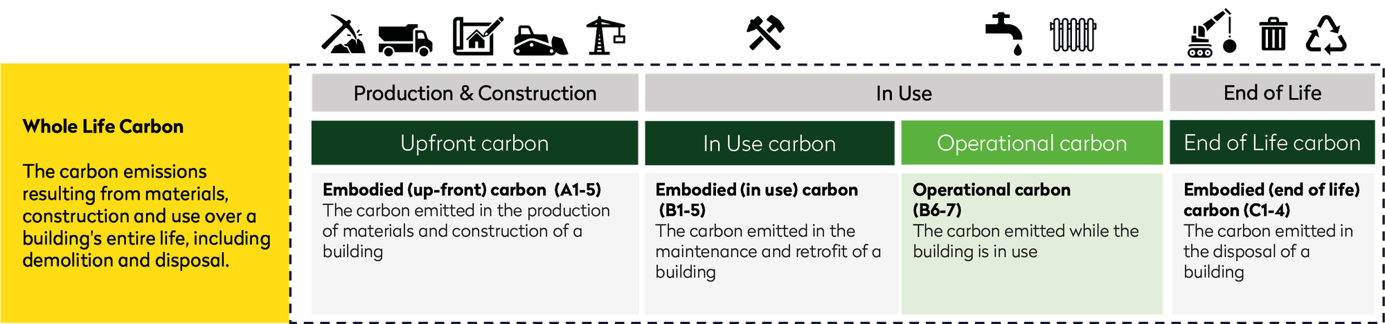 EMBODIED CARBONEmbodied carbon impacts arise from sourcing, manufacturing and supplying the materials required (the ‘Production’ phase); the actual building of the asset (‘Construction’), any maintenance, repair and refurbishment during the ‘In Use’ phase; and ultimately the asset’s demolition or deconstruction, along with waste treatment and disposal (‘End of Life’).