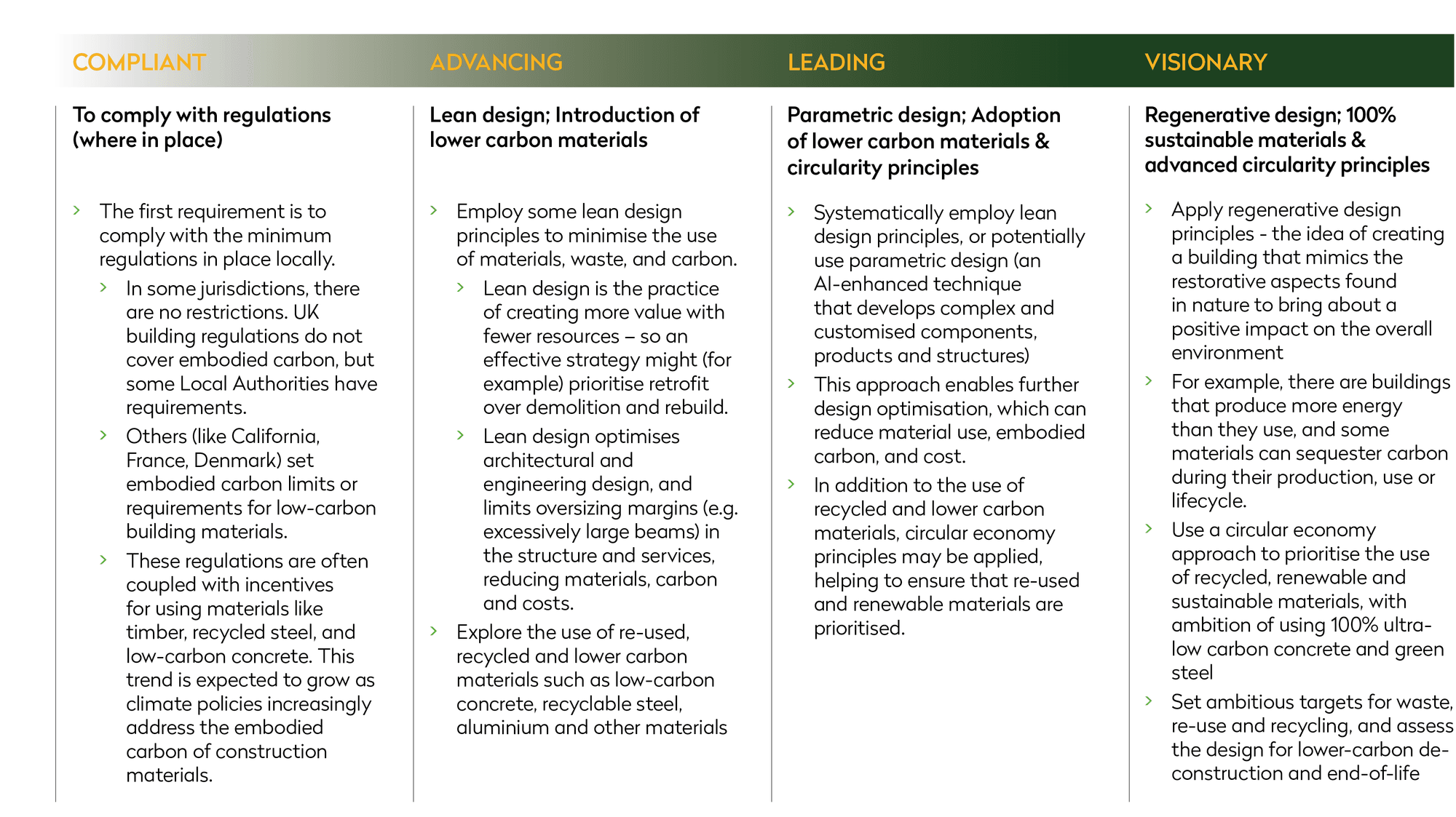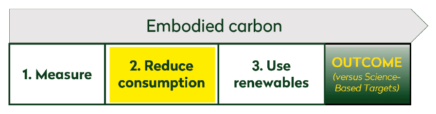 The second stage of the process is to reduce the carbon emitted via the activities measured in step 1. There are various activities that can facilitate this, both in the production, design, and supply of the building materials used, and in the on-site construction process itself.